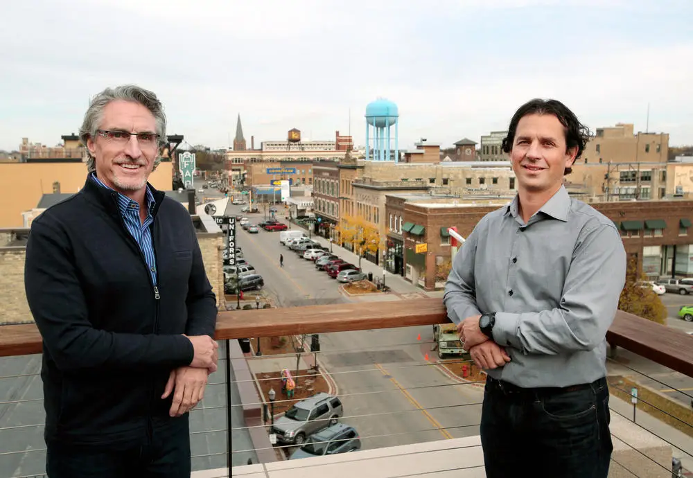 Doug Burgum, Chairman and Founder of the Kilbourne Group, left, and Mike Allmendinger, General Manager of the Kilbourne Group, stand on top of the Loretta Building which overlooks the north end of the businesses on Broadway Friday, Oct. 30, 2015, in downtown Fargo. The Loretta building was refurbished and now houses the company along with several other businesses. Dave Wallis / The Forum